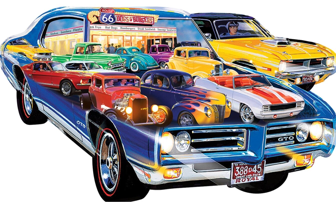 Obrysové puzzle ve tvaru auta připomíná silná auta minulého století. Obsahuje tři speciální dílky ve tvaru auta, klíče a cedule.