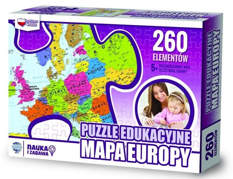 Puzzle z mapą polityczną Europy. Zaznaczono na niej państwa, stolice, większe i ważniejsze miasta oraz dokładną sieć hydrograficzną. Puzzle są doskonałą pomocą uzupełniającą wiedzę w zakresie geografii. Zostały wyprodukowane z bardzo dużą dbałością zarówno o poziom merytoryczny, jak i zgodnie z najwyższymi standardami technicznymi, przy użyciu wysokiej jakości materiałów.