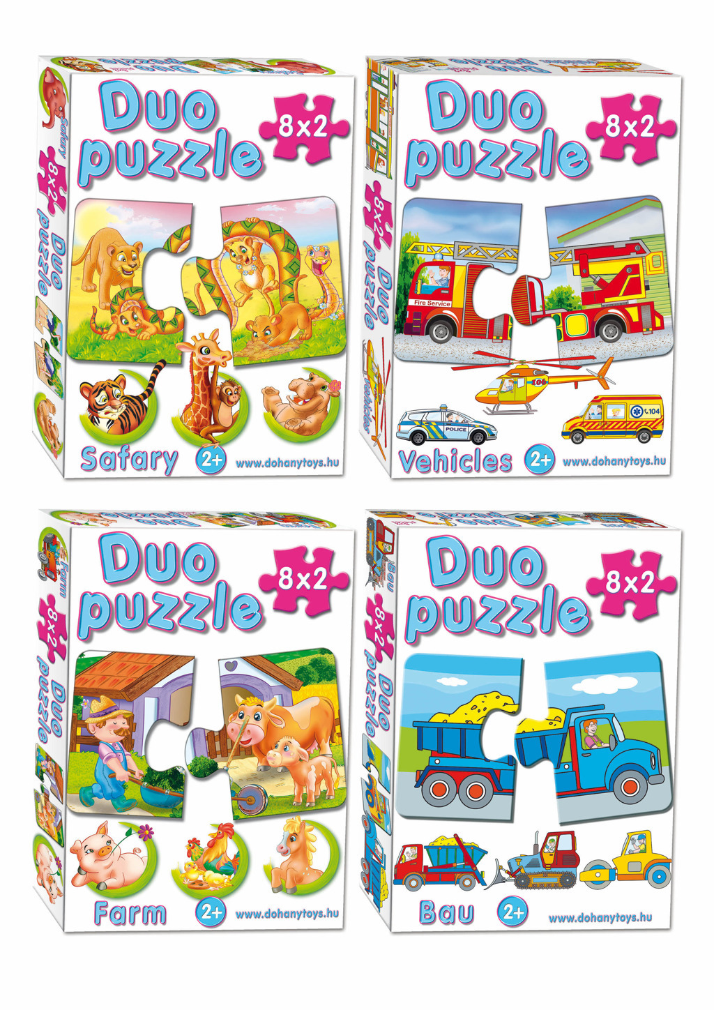 Puzzle Duo 8v1 – safary/doprava/sta­vitel/farma. V každém balení 8 obrázků k tématu. 2 dílky.Vyrobeno v EU. prečítať celé