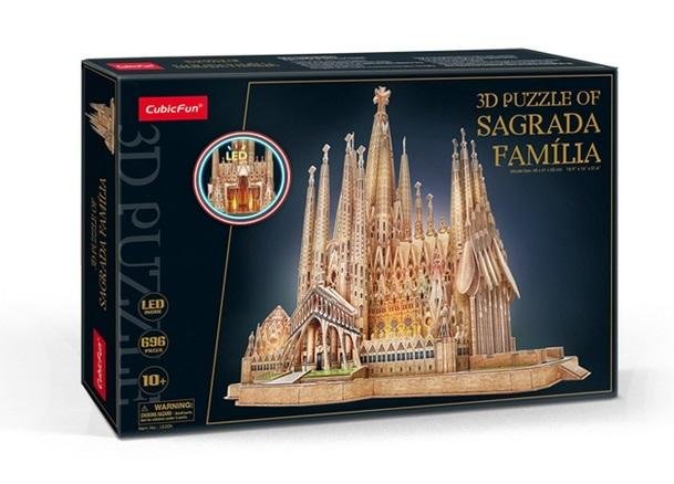 Puzzle 3D Sagrada Familia LED. W opakowaniu znajduje się 696 puzzli, wykonanych ze specjalnego materiału przypominającego piankę. Puzzle są ponumerowane, ponacinane i umieszczone na arkuszach. Wystarczy bez użycia siły wycisnąć element z arkusza i zmontować go zgodnie z dołączoną instrukcją, bez użycia kleju ani specjalnych narzędzi.Wymiary po złożeniu: 48 x 41x 55 cm.