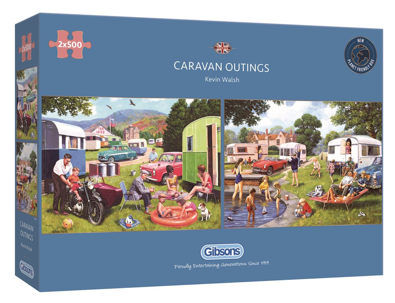 Balení obsahuje 2 puzzle se stejným počtem dílků a rozměrem. Umělec Kevin Walsh nás vzal zpět do 60. let, kdy rodiny ve Skotské Vysočině jezdily na dovolenou svými karavany. Na jednom z motivů je v pozadí hrad Craigievar z roku 1576, který byl inspirací pro Popelčin hrad Walta Disney.