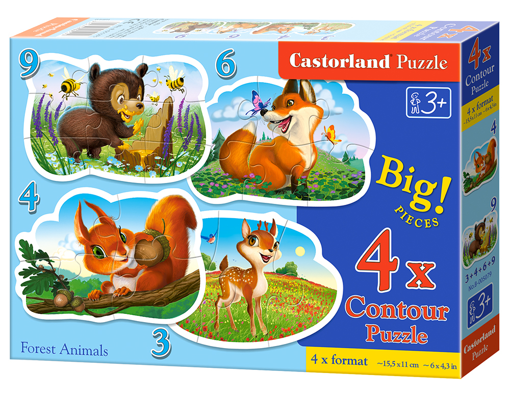 Puzzle Castorland se skládají ze 4 obrysových obrázků s odlišným počtem dílků - 3, 4, 6, 9 ks, které do sebe přesně zapadají. Po spojení všech dílků získáte požadovaný obrázek. Dílky jsou z tvrdého, pevného, kvalitního materiálu. Puzzle rozvíjí kreativní a logické myšlení.