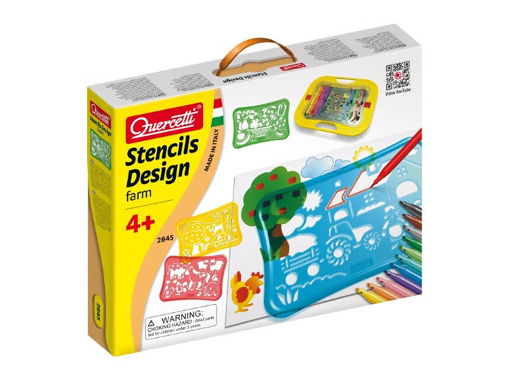 Nová řada šablon farmářských prvků s oblými hranami z pružného materiálu. Kufřík slouží nejen ke skladování 4 šablon a 12 per, ale také k uchycení šablony při malování, které je tak příjemné a vhodné i pro mladší děti. Průhledné víčko kufříku slouží rovněž k uchycení per jak vertikálně, tak i horizontálně. Balení obsahuje také album se spoustou stránek připravených pro dětské malování.