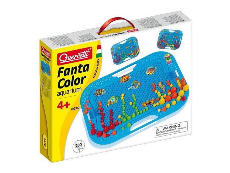 Tematicky zaměřená mozaika rozvíjející manuální zručnost, vizuomotorickou koordinaci a tvořivé myšlení. Pomocí plastových kolíčků různých velikosti dítě skládá obrázky, jež může díky speciálním doplňkům obohatit děti o malé mořské živočichy, kteří v akváriu nemohou chybět. Kufřík se dvěma úchyty, ve kterém je vše úhledně uklizeno, dělá z této mozaiky ideální hračku na cesty.
