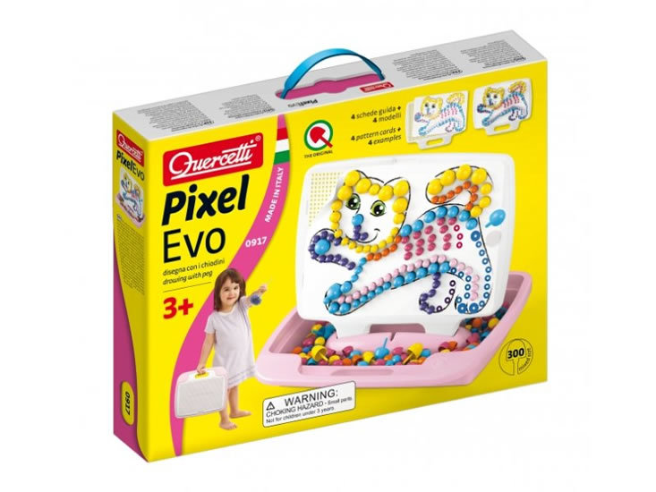 Nadčasová klasická hra s kolíčky značky Quercetti je tu nyní v novém provedení, s novými barvami a novými možnostmi. Díky Pixel Evo Girl má tak perforovaná základní deska madlo se dvěma funkcemi – k přenášení a k ukotvení do košíku ve svislé poloze. Součástí hry jsou i velké obrázkové karty...