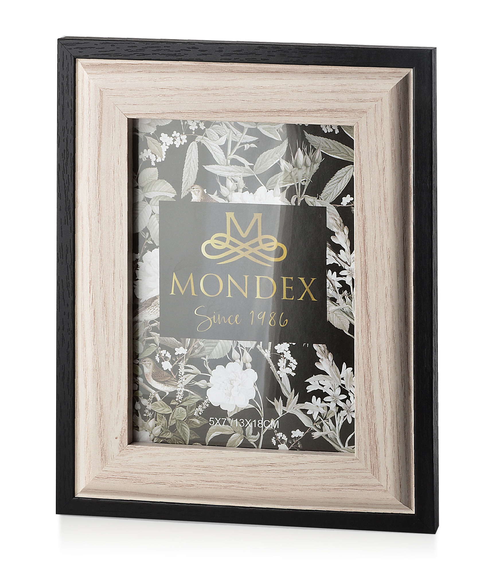 Ramka na zdjęcia z serii ADI marki MONDEX. Wykonana z MDF-u. Rama jest w kolorze czarnym imitującym słoje drewna w połączeniu z naturalnym jasnym drewnem wczęści wewnętrznej. Rozmiar zdjęcia to 13x18cm. Ramkę można postawić jak równieżpowiesić w pionie lub poziomie. Zapakowana...