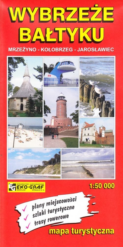 Mapa turystyczna wybrzeża Bałtyku obejmująca swym zasięgiem Mrzeżyno, Dźwirzyno, Kołobrzeg, Ustronie Morskie, Mielno, Darłowo i Jarosławiec. Dodatkowo arkusz zawiera plany Kołobrzegu, Ustronia Morskiego - Sianożęt, Mrzeżyna, Mielna - Unieścia, Łazów, Dźwirzyna, Darłówka i Darłowa.