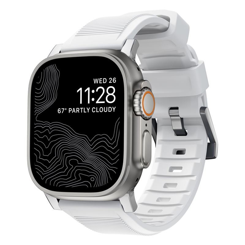 Nomad odolný řemínek, bílý se stříbrnou přezkounavržen tak, aby hodinkám Apple Watch dodal moderní, robustní vzhled pro každodenní nošení nebo na další dobrodružství. řemínek je vyrobený z FKM, měkkého, ale pevného fluoroelastomeru, který kombinuje celodenní pohodlí s dlouhou životností.prodyšný...
