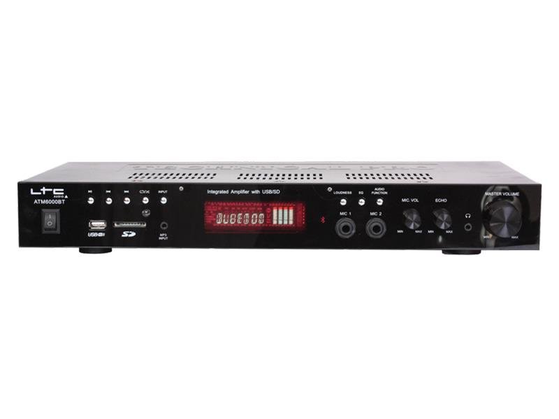 Zesilovač LTC ATM6000BT                        Všestranný zesilovač s vestavěným tunerem FM, který vám umožní plně využít vaši oblíbenou hudbu na všech USB, SD, MP3 a Bluetooth médiích. Stačí připojit jeden nebo dva mikrofony a organizovat Karaoke párty s rodinou a přáteli.Černá klavírní...