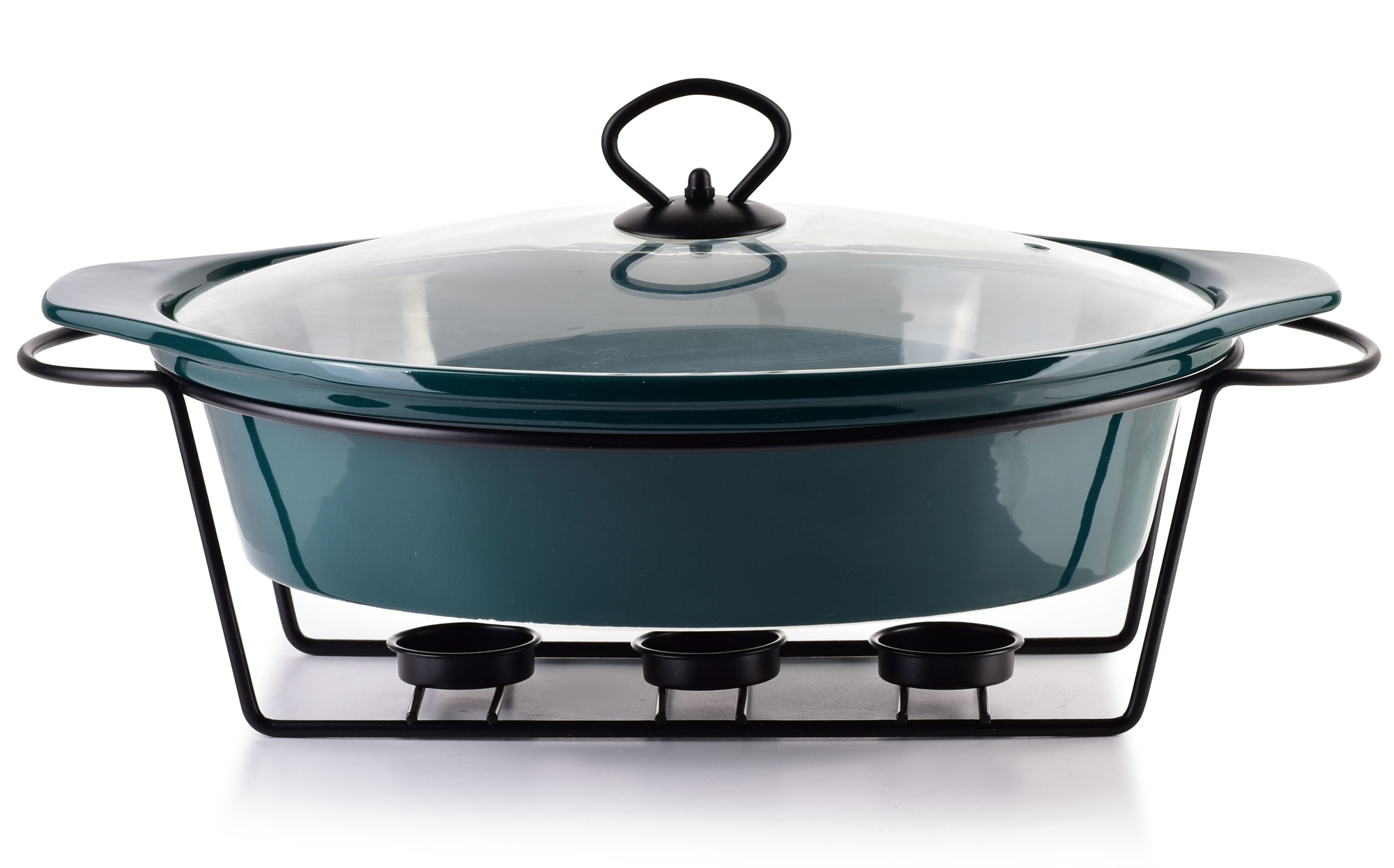 Naczynie z podgrzewaczem marki Allesken z serii MODERN KITCHEN poj. 2,3L, 34x25xh17cm to serwowanie potraw na co dzień i od święta.. Kolor: ciemny zielony, czarny stelaż . Materiał: kamionka ....