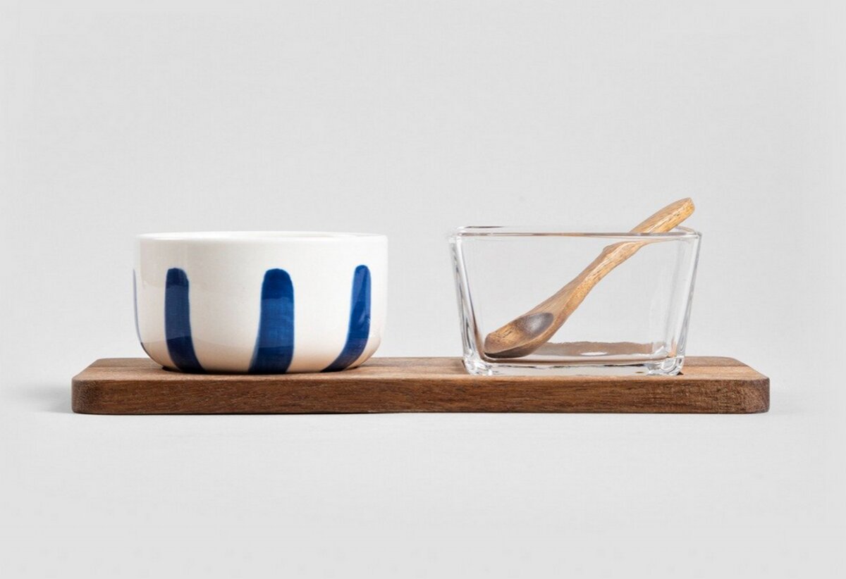 Sada obsahuje: 2 misky, podšálek a lžičku. - Keramika s modrými akcenty ve stylu Hamptons. - Kombinace keramiky, skla a dřeva. - Ideální pro servírování příloh, dipů a koření.Servisní sada MODERN HAMPTONS se 2 miskamiSada MODERN HAMPTONS se osvědčí při podávání malých občerstvení, dipů nebo...