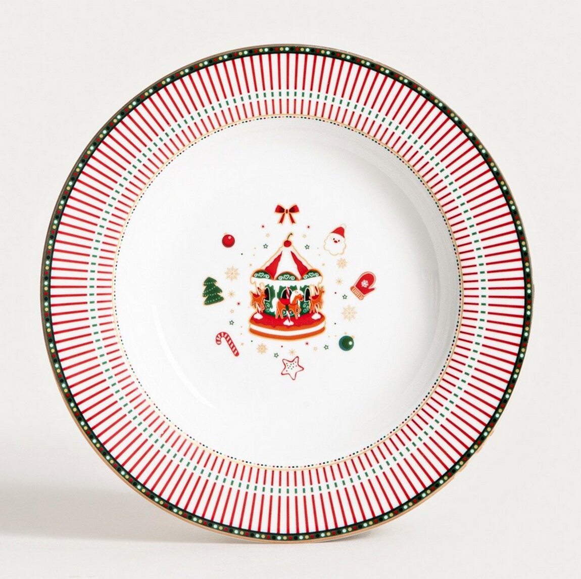 Ideální na vánoční stůl - Cirkusové motivy - Vánoční barvy - Porcelánové nádobí - 150 ml porcelánový vánoční hluboký talíř s cirkusovým motivemHluboký talíř je zdobený půvabným svátečním motivem cirkusového stanu a okraj je zdobený elegantními pruhy. Talíř má nadčasovou zeleno-červenou barevnou...