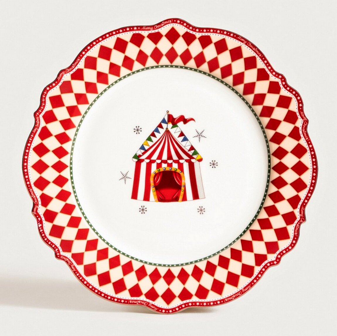 Ideální na vánoční stůl - Cirkusové motivy - Dekorativní tvar - Porcelánové nádobí - Vánoční porcelánový talíř s cirkusovým motivemTento porcelánový talíř s dekorativním tvarem je krásnou ozdobou vašeho nádobí. Talíř má originální dekor s motivem cirkusového stanu a červeno-bílým kostkovaným...