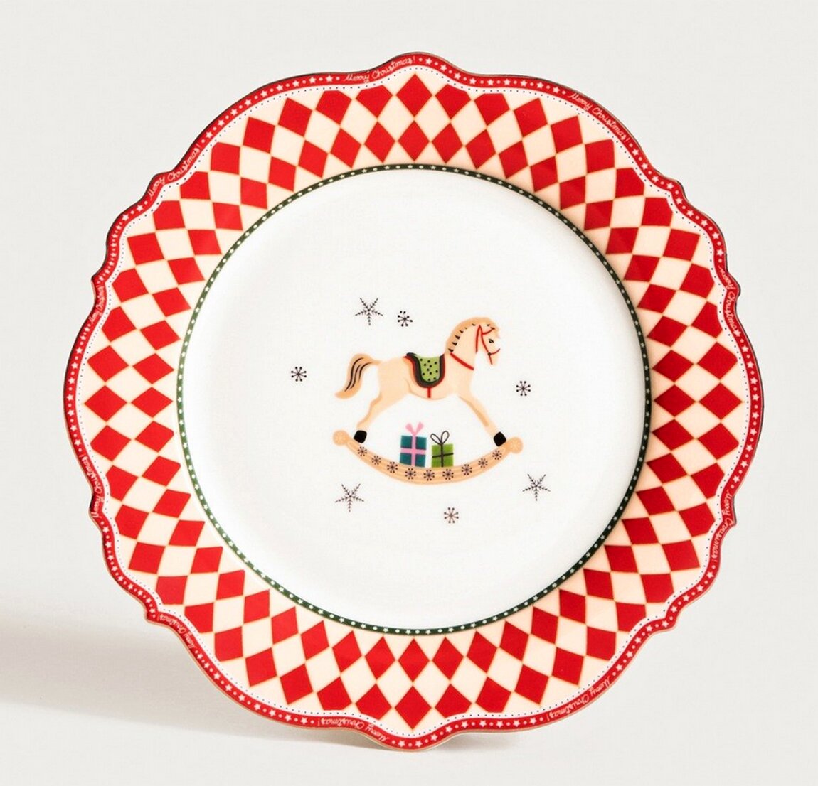 Ideální na vánoční stůl - Cirkusové téma - Dekorativní tvar - Porcelánové nádobí - Vánoční porcelánový talíř s houpacím koněmDekorativně tvarovaný talíř je zdobený barevným vzorem s motivem houpacího koně. Okraj talíře zdobí výrazná mřížka v červené a bílé barvě. Tento hezký talíř dodá každému...