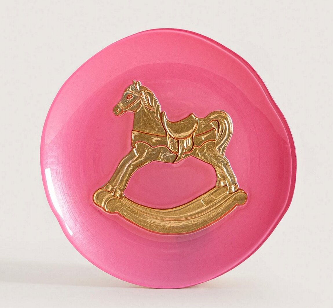 Elegantní nádobí - Růžová - Zlatá dekorace - Průhledné sklo - Růžový skleněný dezertní talíř s houpacím koněmSkleněný dezertní talíř má originální design a okouzlující dekor. Růžový talíř má zlatou dekoraci s motivem houpacího koně. Je to krásný doplněk k vašemu slavnostnímu stolu, který dodá...