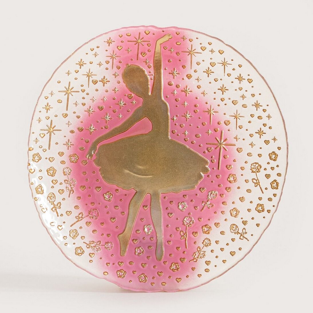 Vánoční motiv baleríny - Růžová barva - Zlatá dekorace - Skleněné nádobí - Růžový skleněný talíř s baletkouRůžový talíř je krásným kouskem nádobí pro vánoční období. Talíř je zdobený zlatým motivem baletky. Pohádkový motiv tanečnice připomíná balet Louskáček. Růžovo-zlatá barevná kombinace dodá...