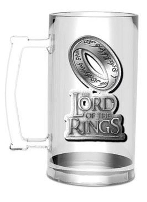 Skleněný korbel s kovovým logem a grafikou filmové ságy Pán Prstenů.