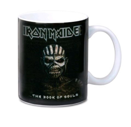 Bílý keramický hrnek s logem skupiny Iron Maiden a grafikou jejich šestnáctého studiového alba The Book of Souls.