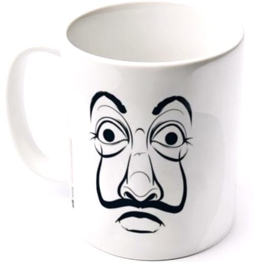 Bílý keramický hrnek s motivem masky, textem a logem La casa de papel.