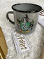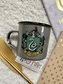 Šedý hrnek se znakem školní koleje - Zmijozel, z filmové sci-fi ságy Harry Potter.