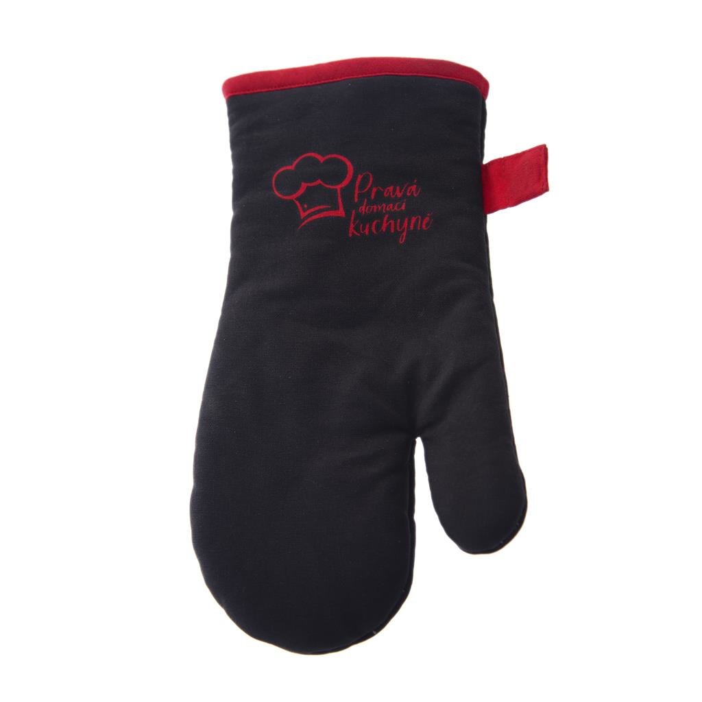 Tato bavlněná rukavice je v praktické černé barvě s červeným lemem a potiskem, díky čemuž se na ní ztratí lecjaká skvrna. Ladící červené poutko umožňuje její zavěšení. Rukavici perte maximálně na 30 °C.