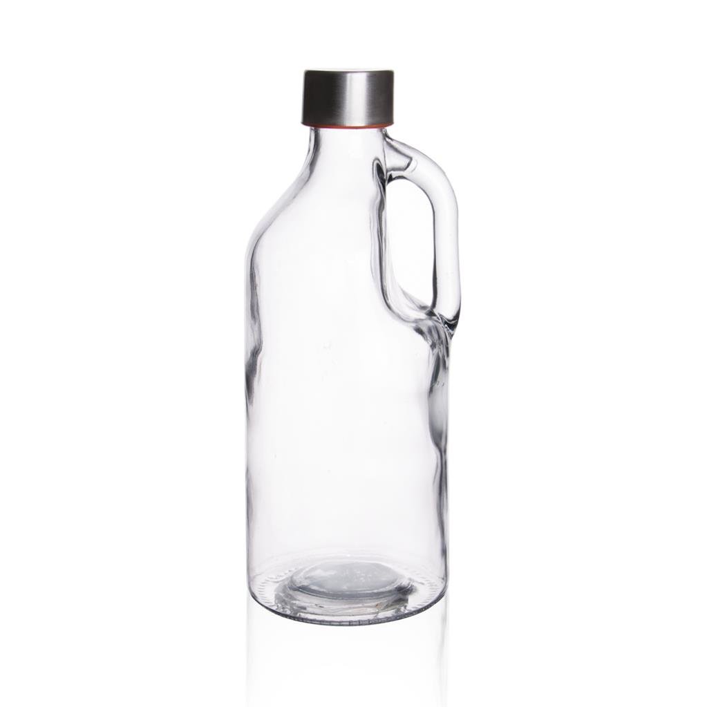 Láhev s uchem a uzávěrem na závit. Materiál: sklo, kov, plast, silikonové těsnění. Rozměry: objem 1,15 l, pr. 9,5 cm, v. 25 cm. prečítať celé