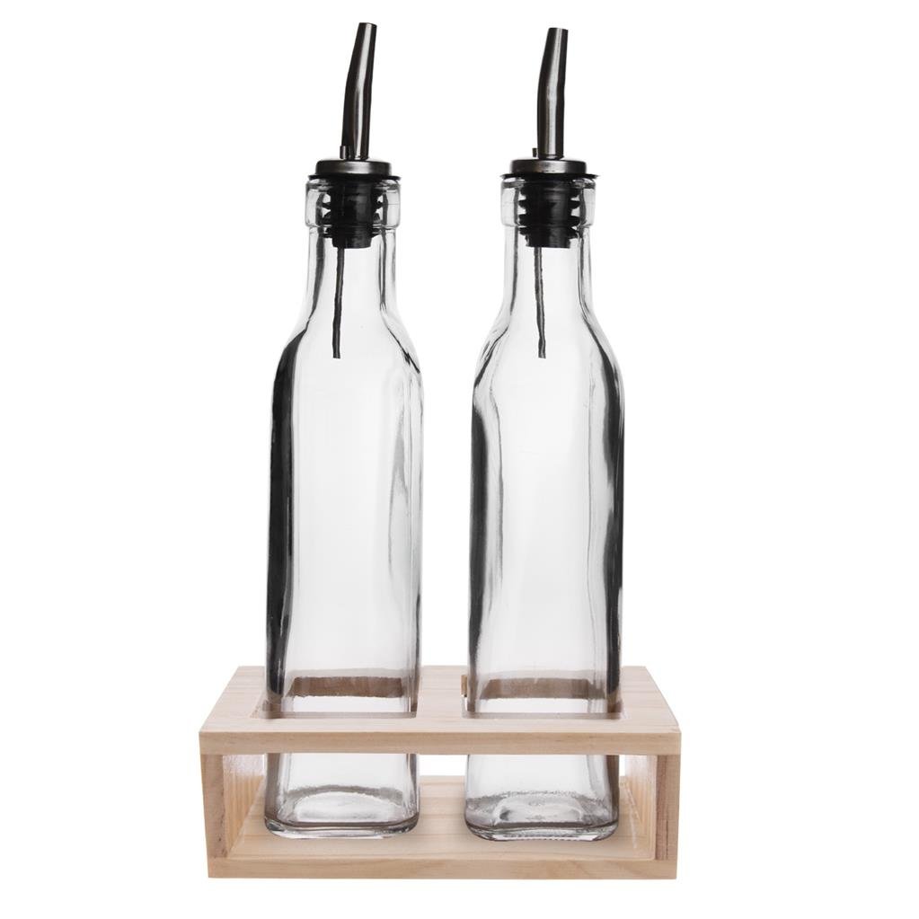 Dřevěný stojan s dochucovací soupravou Vám umožní mít olej a ocet vždy po ruce při domácím i venkovním stolování. Můžete ho umístit všude tam, kde je právě zapotřebí. Materiál: stojan – dřevo, láhve na olej a ocet – sklo, kov, plast. Rozměry: 14x8x27 cm, nádoba na olej/ocet objem 0,3 l, 5x5 cm, v. 26 cm.