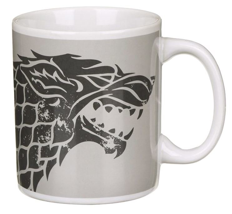 Bílý keramický hrnek s logem seriálu, rodovým znakem Starků a jejich slovy Winter is Coming ("Zima přichází").