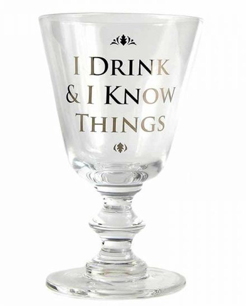 Oficiální sklenice z katalogu produktů s logem, fotografiemi a grafikou populárního amerického fantasy dramatického seriálu Game of Thrones.