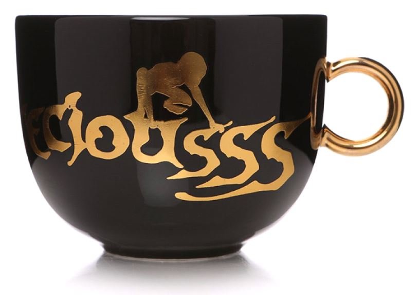 Černý keramický hrnek se zlatým potiskem inspirovaným ikonickou postavou Golluma. Hrnek má zlatou rukojeť ve tvaru prstene.
