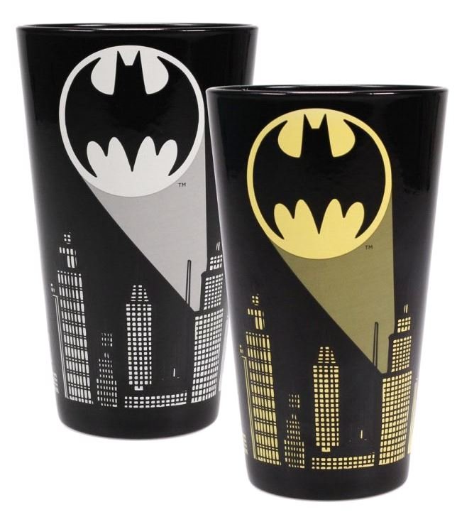 Oficiální sklenice a doplňkové zboží z katalogu produktů s logem, fotografiemi a grafikou filmu Batman od společnosti DC Comics.Zboží je legálně licencováno a prodáváno se souhlasem vlastníků licenčních práv.Proměňovací sklenice s grafikou města společne s logem a na zadní straně se nachází text...