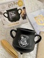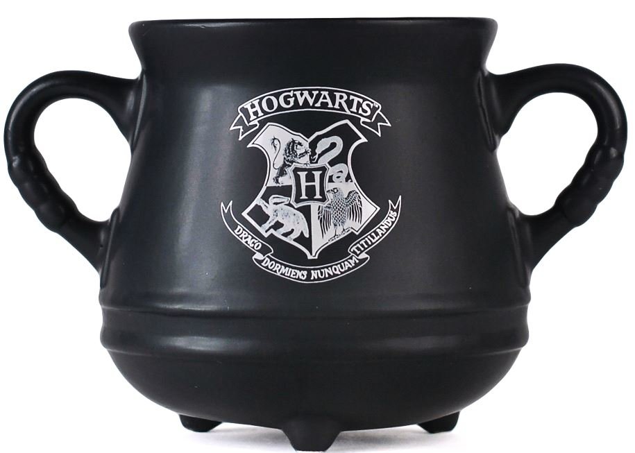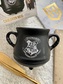 Černý keramický hrnek ve tvaru kotlíku s logem Bradavic.