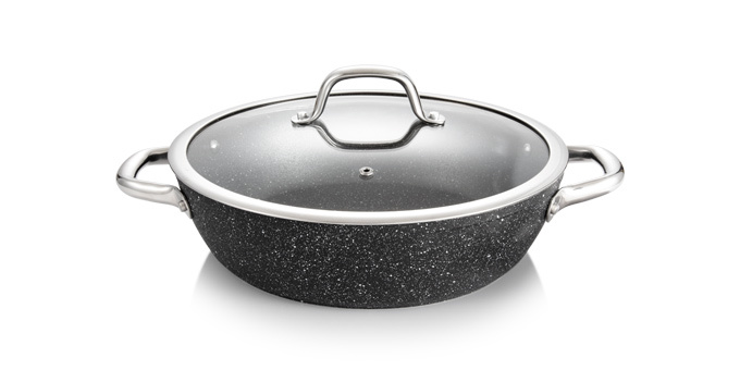 Luxusní nádobí s prvotřídním antiadhezním povlakem vhodným pro kovové kuchyňské nářadí. Pokrmy se na nepřilnavém povrchu s charakterem neleštěného přírodního kamene nepřipalují, vaření je rychlé a rovnoměrné. Masivní sklonerezová poklice s otvorem pro páru, vodotěsné nerezové úchyty a indukční dno. Vhodné pro všechny typy sporáků a pečicích trub (s poklicí max. 200 °C). Vhodné do myčky. 5 roků záruka.