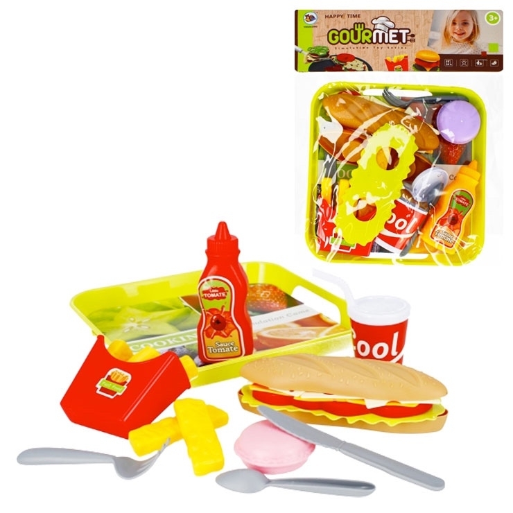 Souprava rychlé občerstvení bude perfektním doplňkem každé dětské kuchyňky! Obsah sady obsahuje: podnos, hranolky, kečup, nápoj, hot-dog, sušenky, příbory, kleště. Rozměry [cm]: tácek 20x20x2, Výrobek je určen pro děti ve věku 3+. prečítať celé