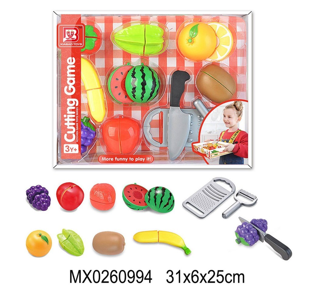 oto ovoce je vyrobeno z kvalitního a odolného plastu, což zajišťuje dlouhou životnost a bezpečné použití. Každý kus ovoce se skládá ze dvou částí spojených suchým zipem, takže děti mohou ovoce snadno „rozkrojit“ a zase spojit. Pomocí bezpečného plastového nože se děti naučí správně krájet ovoce,...