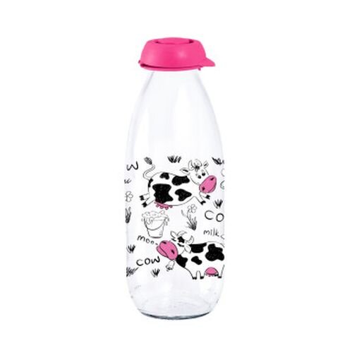 láhev 1,0l na mléko, růž.KRÁVA, plast.uzávěr, sklo