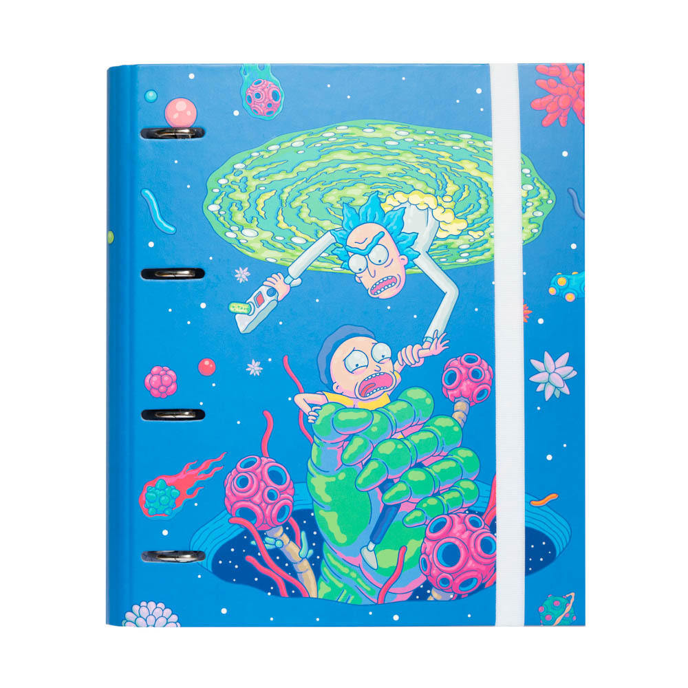 4 kroužkový pořadač inspirovaný seriálem Rick And Morty. Pořadač má stahovací pásek, který slouží proti nechtěnému otevření.