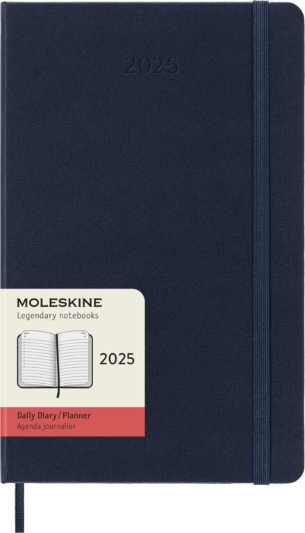 Klasický velký modrý denní diář na rok 2025. Na každý den stránka pro poznámky a schůzky. Diář má pevnou, ve hřbetu šitou vazbu v kartonových deskách. Obepíná ho pružná páska proti samovolnému otevírání. Obsahuje praktickou vnitřní kapsu na vizitky a dokumenty, textilní záložku, 3 sady samolepek...