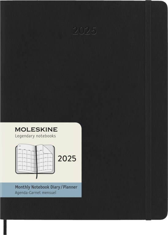 Extra velký Moleskine Měsíční diář na rok 2025. Měsíc je zobrazen na dvou stránkách, po kterých následují dvě linkované stránky. Na konci je 51 linkovaných stránek na poznámky. Diář má měkkou, ve hřbetu šitou vazbu. Obepíná ho pružná páska proti samovolnému otevírání. Obsahuje praktickou vnitřní kapsu, textilní záložku, 3 sady samolepek a 1 sadu samolepek s letopočty. Papír s gramáží 70 g/m2 neobsahuje kyseliny.