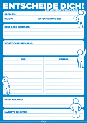 Täglich treffen wir mehrere Hundert Entscheidungen. Die meisten davon unbewusst und in Sekundenschnelle. Doch es gibt auch Entscheidungen, die wohl bedacht sein sollten, und bei denen es Pro und Kontra abzuwägen gilt. Eigens dafür wurde der praktische Block Entscheide dich! entwickelt. Auf nur einer Seite lassen sich alle Facetten eines Problems zusammenfassen und veranschaulichen. So wird es ein