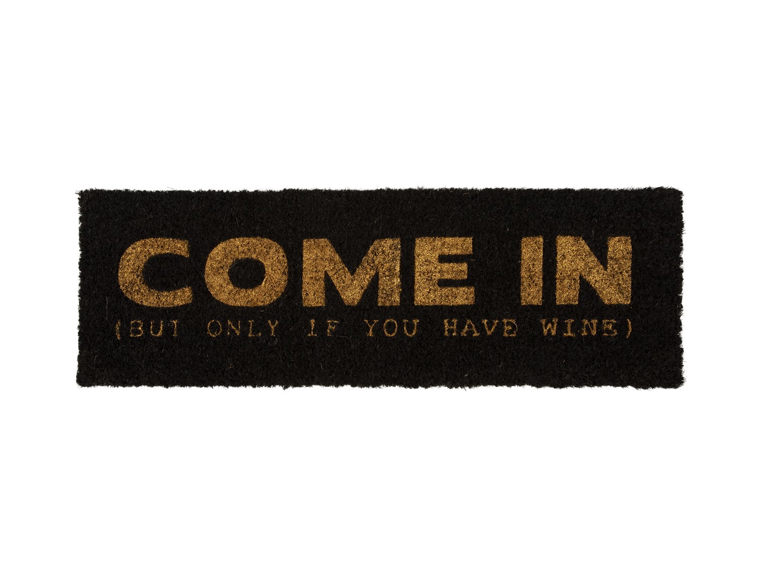 Rohožka v černé barvě s hnědým nápisem COME IN.