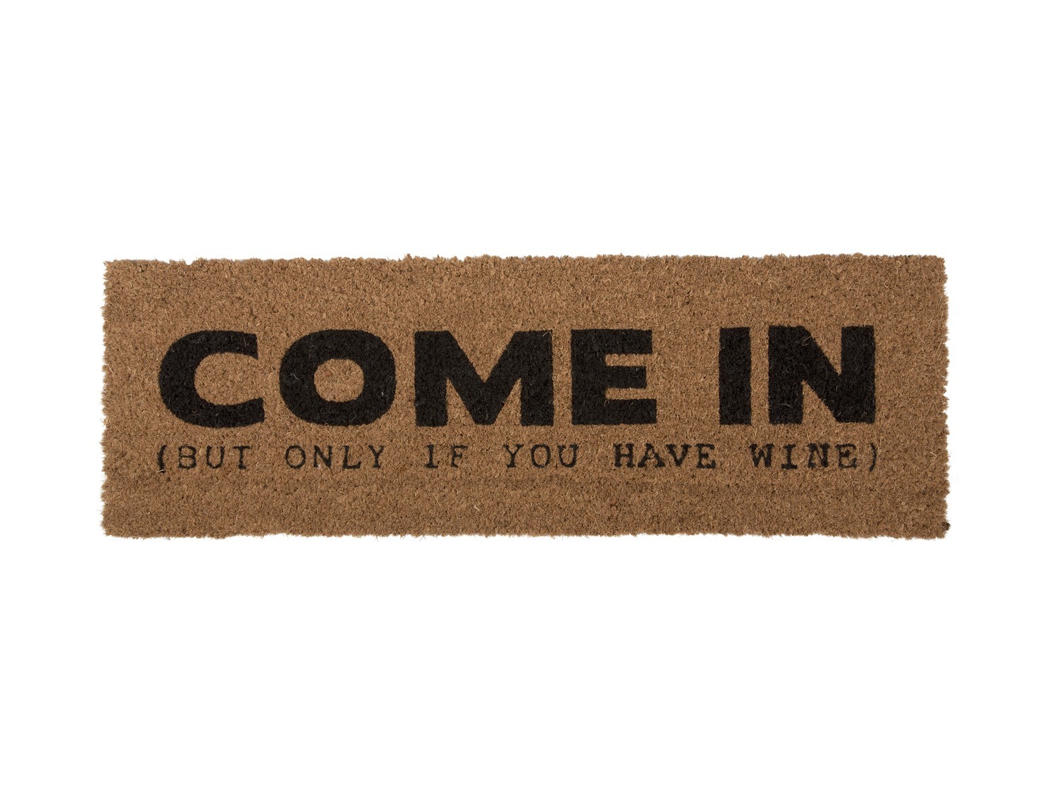 Rohožka v hnědé barvě s černým nápisem COME IN.