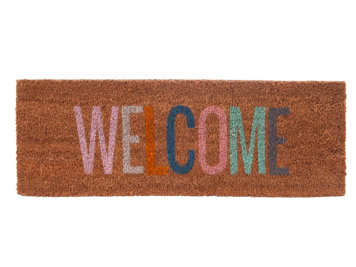 Rohožka v hnědé barvě s barevným nápisem Welcome.