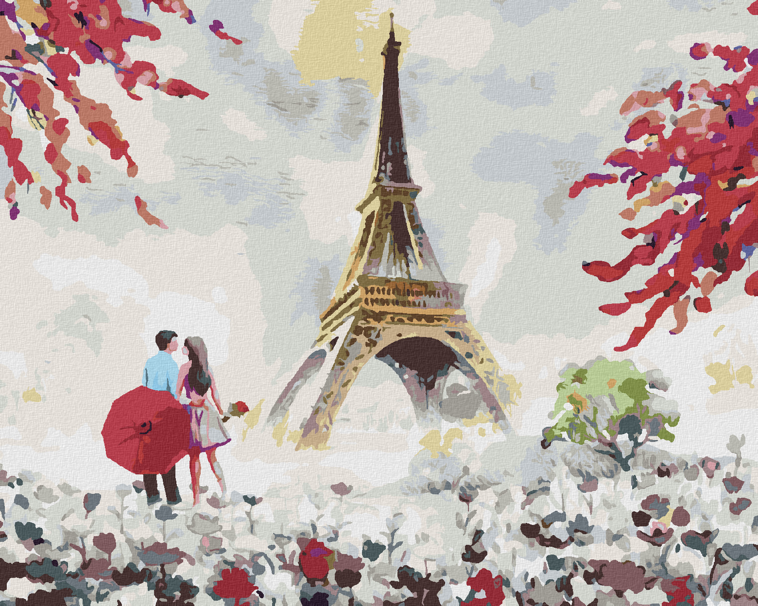 Malování podle čísel - EIFFELOVA VĚŽ A ŽENA S KVĚTINAMI - 40x50 cm, bez rámu a bez vypnutí plátna