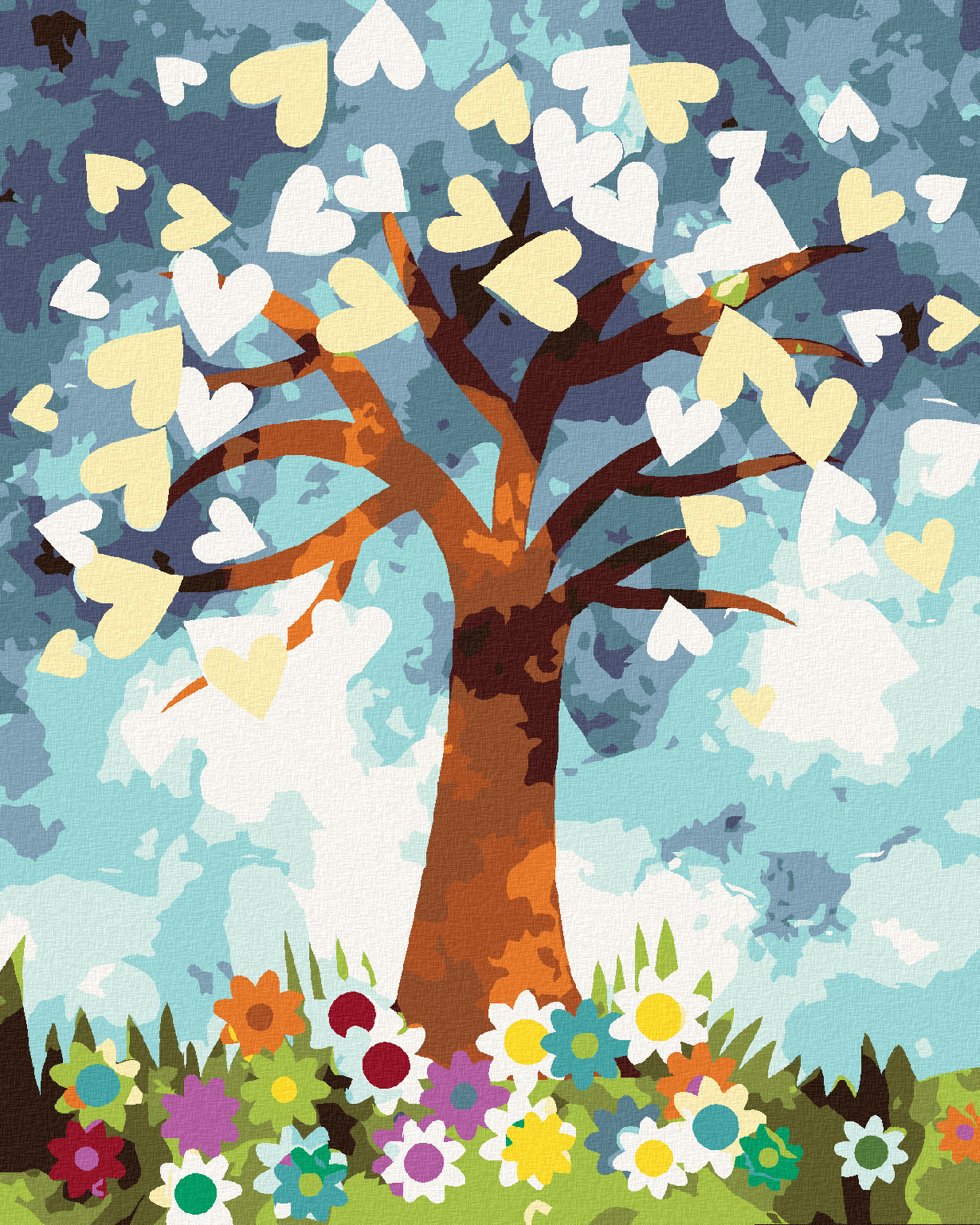 Malování podle čísel - SRDCOVÝ STROM A KVĚTINY - 80x100 cm, vypnuté plátno na rám