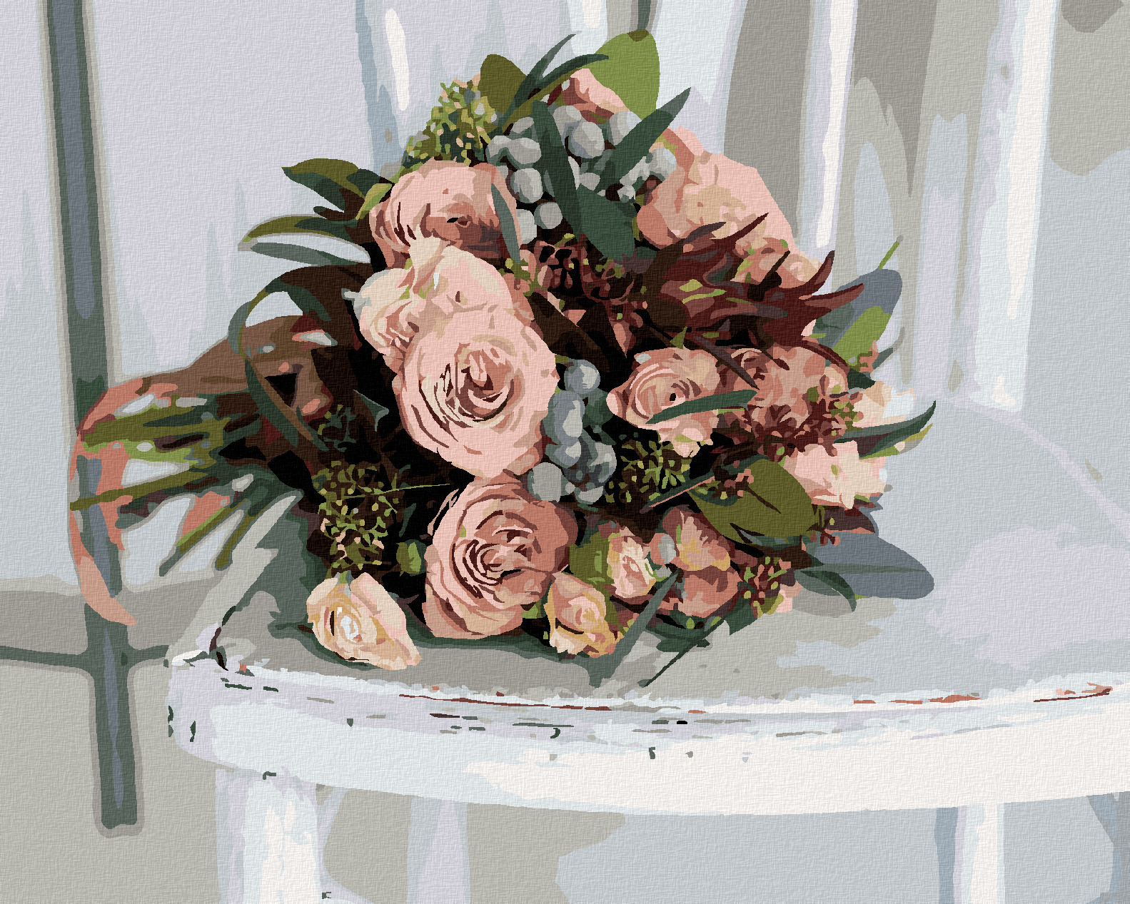 Malování podle čísel - KYTICE RŮŽÍ NA BÍLÉ ŽIDLI - 40x50 cm, bez rámu a bez vypnutí plátna