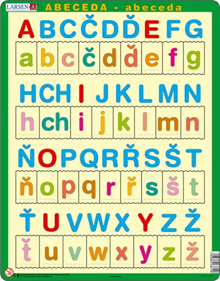 Česká abeceda s háčky i čárkami.V pevném rámečku je 34 dílků s písmeny abecedy.Pod každé VELKÉ písmeno vlož dílek s odpovídajícím písmenem MALÝM. Každý dílek je jedinečný a jde vložit pouze na správné místo. prečítať celé