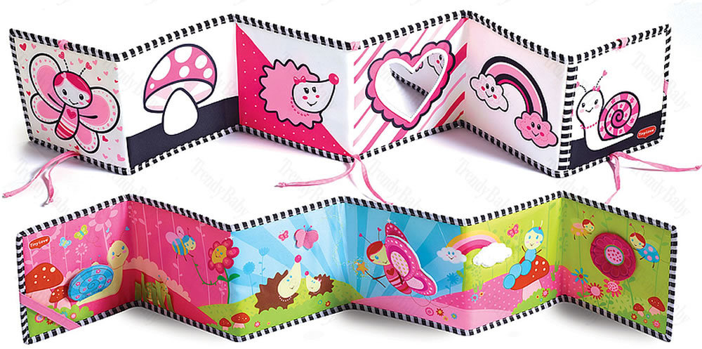 Oboustranná první knížka Tiny Love upoutá dítě svými kontrastními veselými obrázky. Jedna strana ideální pro děti od narození do 3 měsíců, druhá ro děti od 3 do 6 měsíců. Kniha stimuluje rozvoj jeho zraku dítěte a podněcuje dítě ke hře na bříšku. Šňůrky umožňují knížku připevnit k bočnici postýlky. Vhodné pro děti od narození.