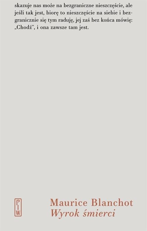 ?Pisanie jest po trosze umieraniem? ? hołdując tej zasadzie, Maurice Blanchot, jeden z wielkich samotników dwudziestowiecznej literatury, poświęcił się pisaniu. Wyrok śmierci, najsłynniejsza z jego krótkich powieści, ma pozory autobiografii, ale kiedy Blanchot pisze: ?Te wypadki przydarzyły się w...