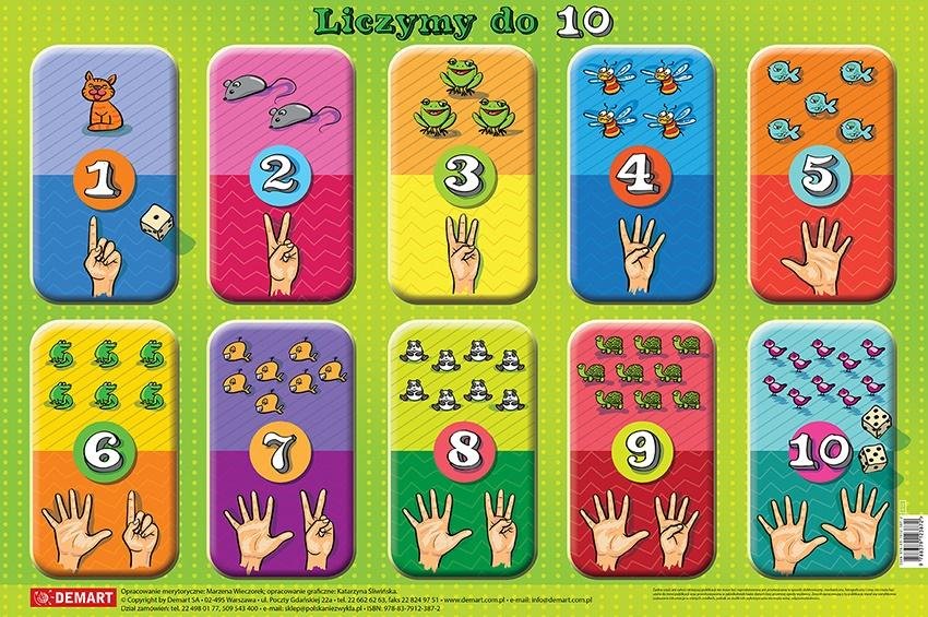 Podkładka przeznaczona jest dla dzieci w wieku 4–6 lat. Pomaga w poznawaniu liczb od 1 do 10 i w zrozumieniu pojęcia liczby w ogóle. Pola przypominające duże przyciski podzielono na dwie części. W górnej – umieszczono proste rysunki interpretujące poszczególne liczby naturalne, np. dziewięć żółwi...